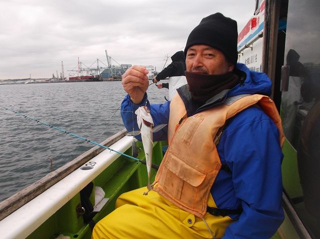 最初のうちは数投ごとに船頭さんがポイント移動。潮が止まるので、ポイントを探すとのこと。天気は曇りでそれほど寒くはありません。波もそれほどでもなく、コンディションは最高です。スタートは調子良かったものの、やはり20分ほどでアタリが激減。あってもかじられておしまい、ということも多々。我々は右舷側でしたがなぜか全くアタリがなく、左舷側のみ15分くらい釣れたようです。