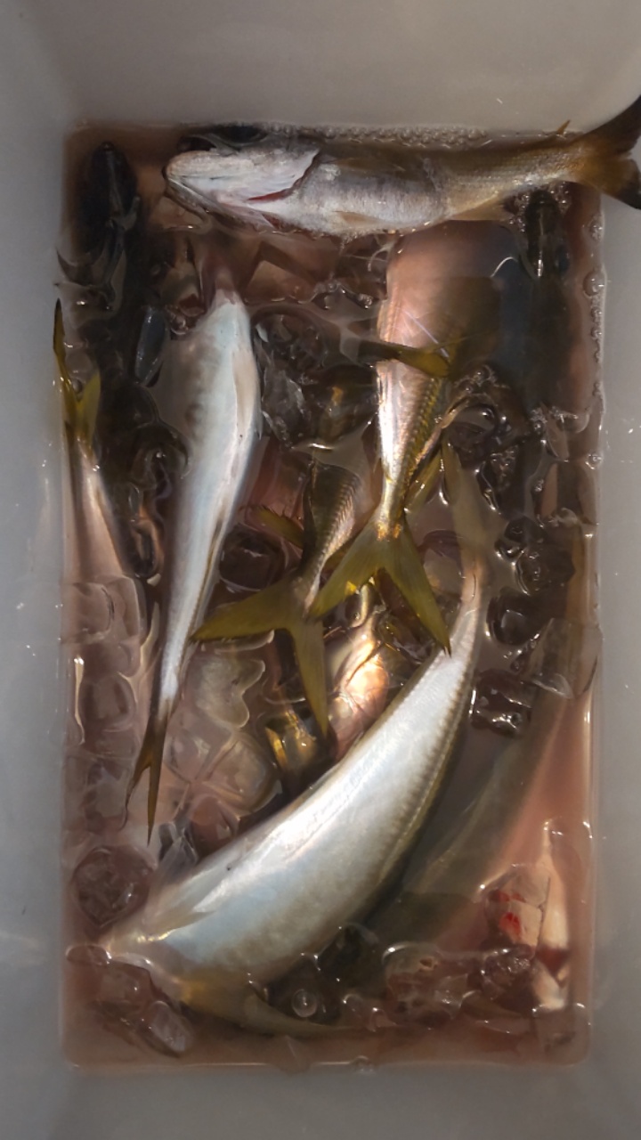 仕掛けを交換しながら、船頭さんにあと何分くらいで終わりですか?って聞くと「あと20分だね」とのこと。もう1,2流し出来そう。最後の1投は何か違和感、みたいな後に巻いてみたら今日イチの小さいなアジがダブル。これで終了。数えると22匹でした。小アジは最後の2匹のみであとは中~大アジ。1月に行ったアジ釣りよりもクーラーボックスは確実に重いです。片付けをして、船は港に戻りますが、20分ほどで帰港。やはり楽です。
