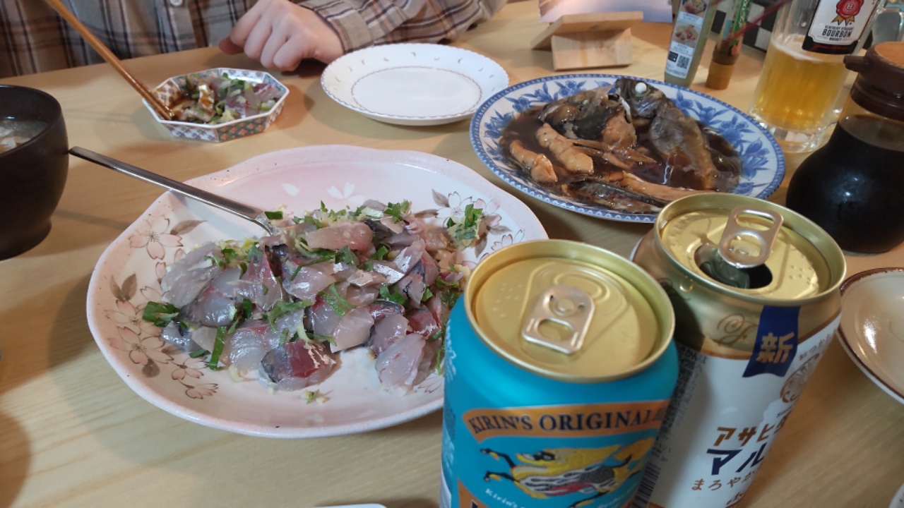 釣果を聞くと、トップは42匹。まんすりーさんのお隣のおばちゃんで、どうやら常連さん。続いて40匹。せんばたちは20匹ちょいでまあ平均かな?って感じです。季節的にも厳しい釣りを予想していたので、満足しつつ、次回はお祭り対策を考えようと話しながら帰ってきました。16時過ぎには家に戻ったのでそこから3時間で処理を頑張って終わらせました。食べると脂も乗っており、走水のアジ、これは次回もアリ!という二人の結論でした。次は恒例の5月後半からの房総イサキ。またまた電動リールの活躍が期待されます。今回もまんすりーさん、お世話になりました。