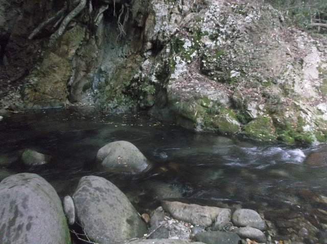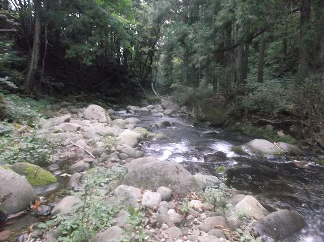で、3本目の川。80歳になる師匠はここでしばし休憩モード。20匹まであと1匹なので、せんばに下から登っておいで、と車の近くで待っているそう。ちょうど上から釣り場が見えるので、見失う心配もないので安心なのでしょう。さっそく川に入り、淵を狙って釣り上がります。アタリはそれほどないものの、釣ったりバラシたりしながら40分くらいで師匠のところへ戻ります。「2匹釣って2回バラシたでしょう(笑)」とお見通し。