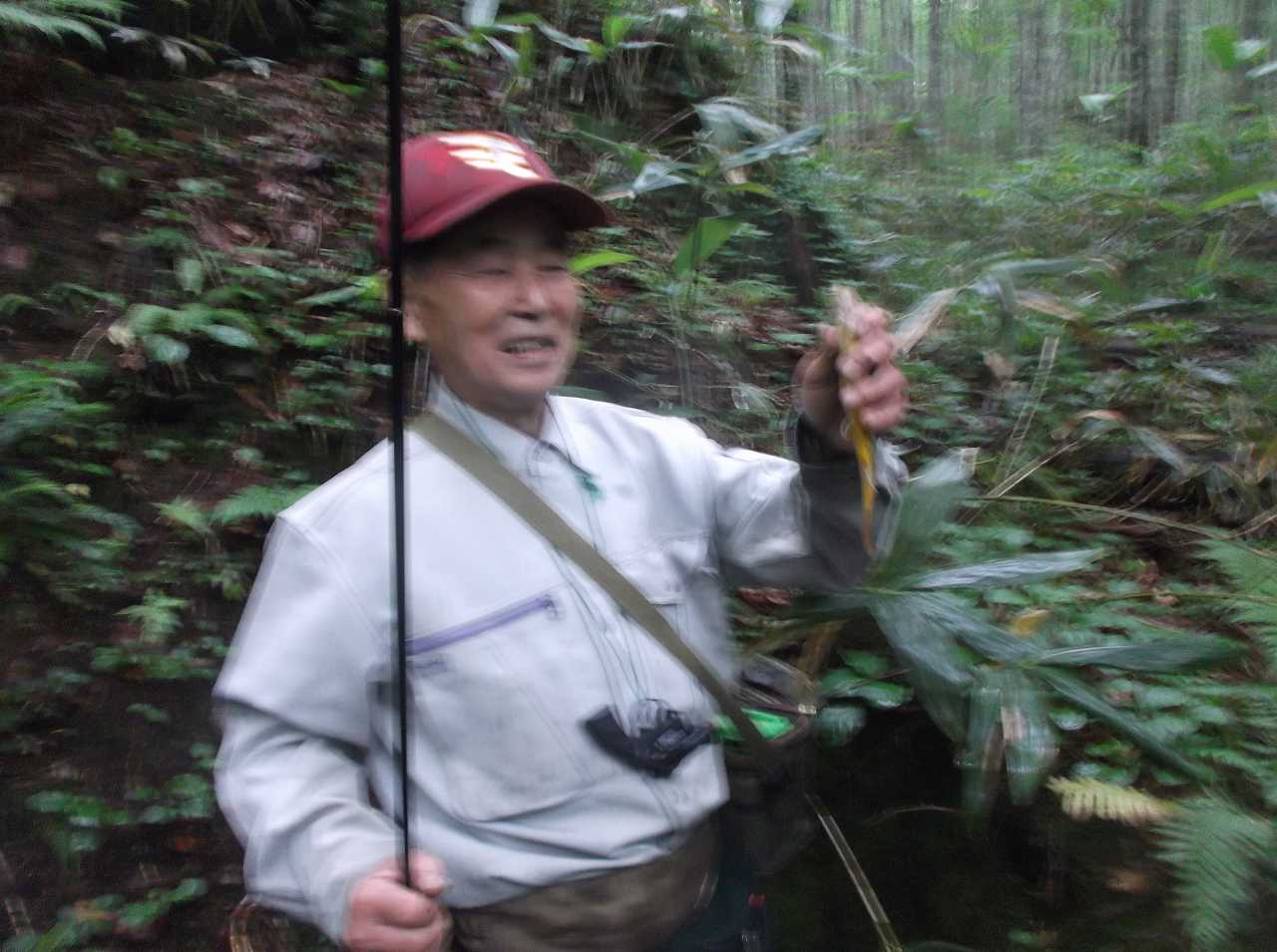 けっこう勾配があり、いったん竿をしまって上に上り、ポイントで竿を出す、という感じで釣り上ります。少し上がるとようやく7寸サイズが上がってきてちょっと満足。マイナスイオンの森の中に居るだけで癒され、極楽気分です。幸い雨が上がって薄日も射しています。結局ここでは7匹のイワナで終了。サイズは今一つですが、ここに来られただけありがたいです。