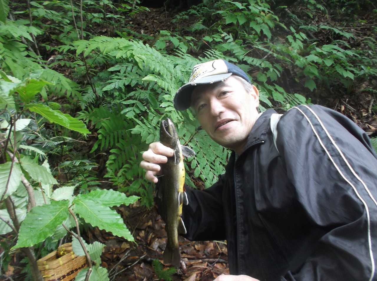 2時前にいつもの滝まで行って終了、と思い餌を流します。と岩陰からすーっとイワナが近づきパクリ。目の前に見えました。しっかり食わせて竿を上げると今までとは違う重さ。これはでかい!とようやく上げたのは9寸を超える大満足のイワナです。最後に今日一番のサイズが上がり気持ちよく納竿。後半は4匹でした。
