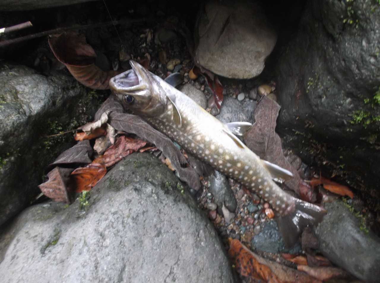 どばを流すとさっそくアタリ。くわえて走ったのか、水中の木に引っ掛かりいきなりのロスト。そこからアタリはあるものの、かじられるだけ。ちょっと小さいのでしょう。少し上で小さめのイワナ。これは針を飲まれてしまいやむなくキープ。せめて7寸をと狙うのですが釣れるのは6寸ちょいのリリースサイズ。何回かリリースしますが、飲まれたやつだけ魚籠に。