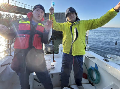 幸いお祭りを免れているせんば、2投めもすぐにアタリが。今度は2匹。なかなかに良いペースです。この時は噂に聞いた、途中で錘が沈まなくなる、という状態でびっくりしてすぐに巻き上げ開始。良型の2匹であれっ?って感じです。3回目まではかなり順調。ただ130mくらいでまたまた錘が止まったのですが、これはただ深さが変わっただけ。巻き上げたものの、空振りでした。