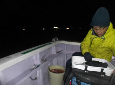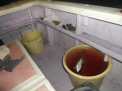 下道をのんびり走り、途中で休憩を取りながら集合時間15時ちょい前には港に着きました。車を止めると前後3台すべて大宮ナンバー。その前に足立ナンバー。他県ナンバーだらけです。やはり人気のキンメダイ釣り。釣りの中ではかなりお高い13500円と仕掛け1000円を買って船に乗り込みます。左右に6人ずつ、せんばは大ともに1人。危険が少ない方をまんすりーさんが譲ってくれました。これが後ほど大きなポイントになりました。