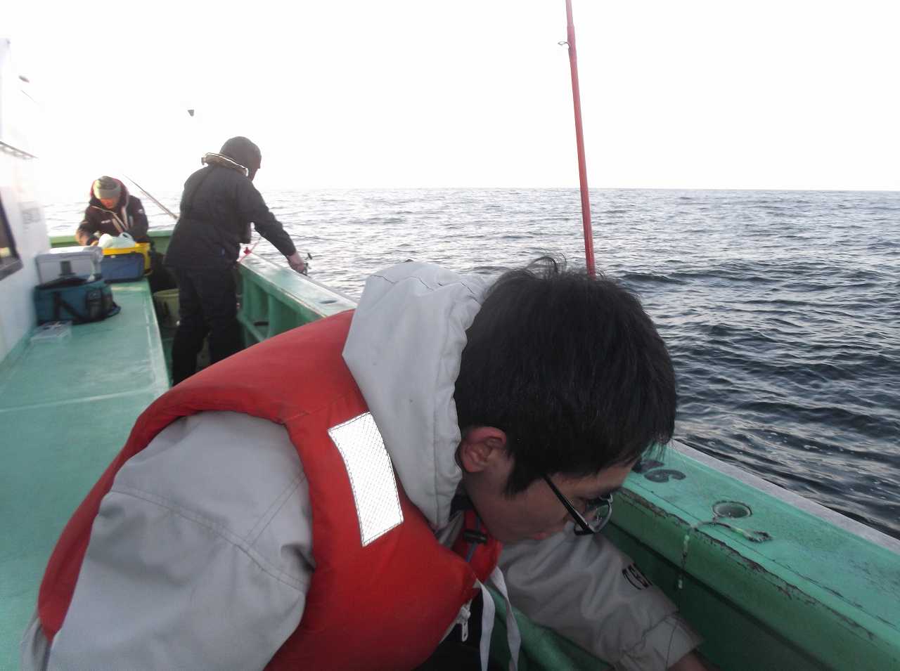 岸払いが5時。船はいつものきくしん丸さんです。幸い天気も良く、波もそれほどは無い予報。2人で酔い止めを飲んでの出発でした。1時間ほどで釣り場に到着。波はそれほどではないものの、軽くうねりがあります。それでも釣り方をレクチャーして釣り開始。パワーイソメを自分で着けて、最後に本物が良いだろうと房がけの最後の1匹だけ青イソメを付けてみました。寒くて手がかじかみつけにくそう・・・。やはり最低気温0度は私は慣れているものの、関東に住んでいた息子には厳しかった様子。