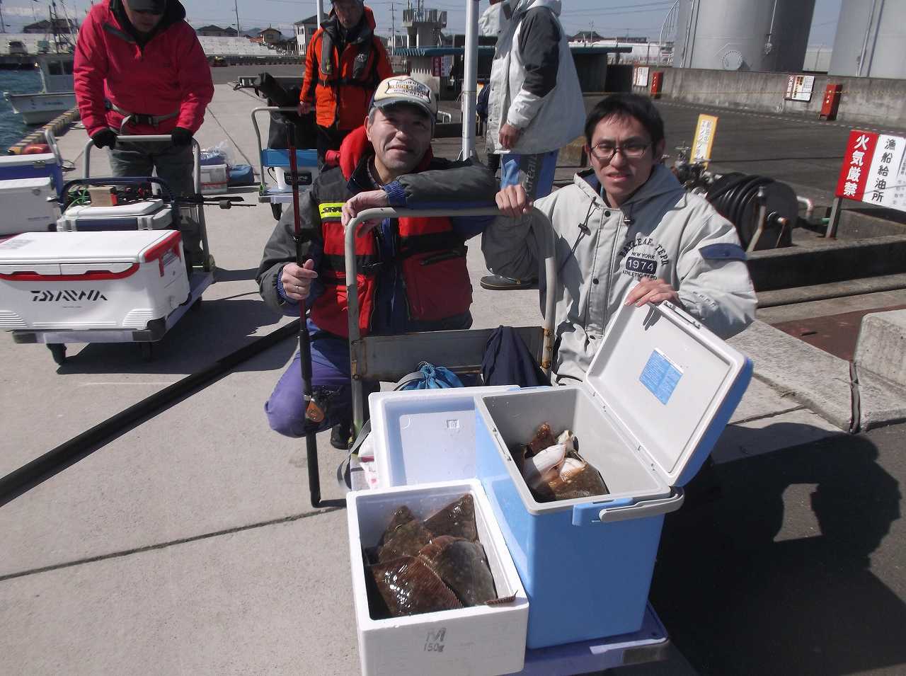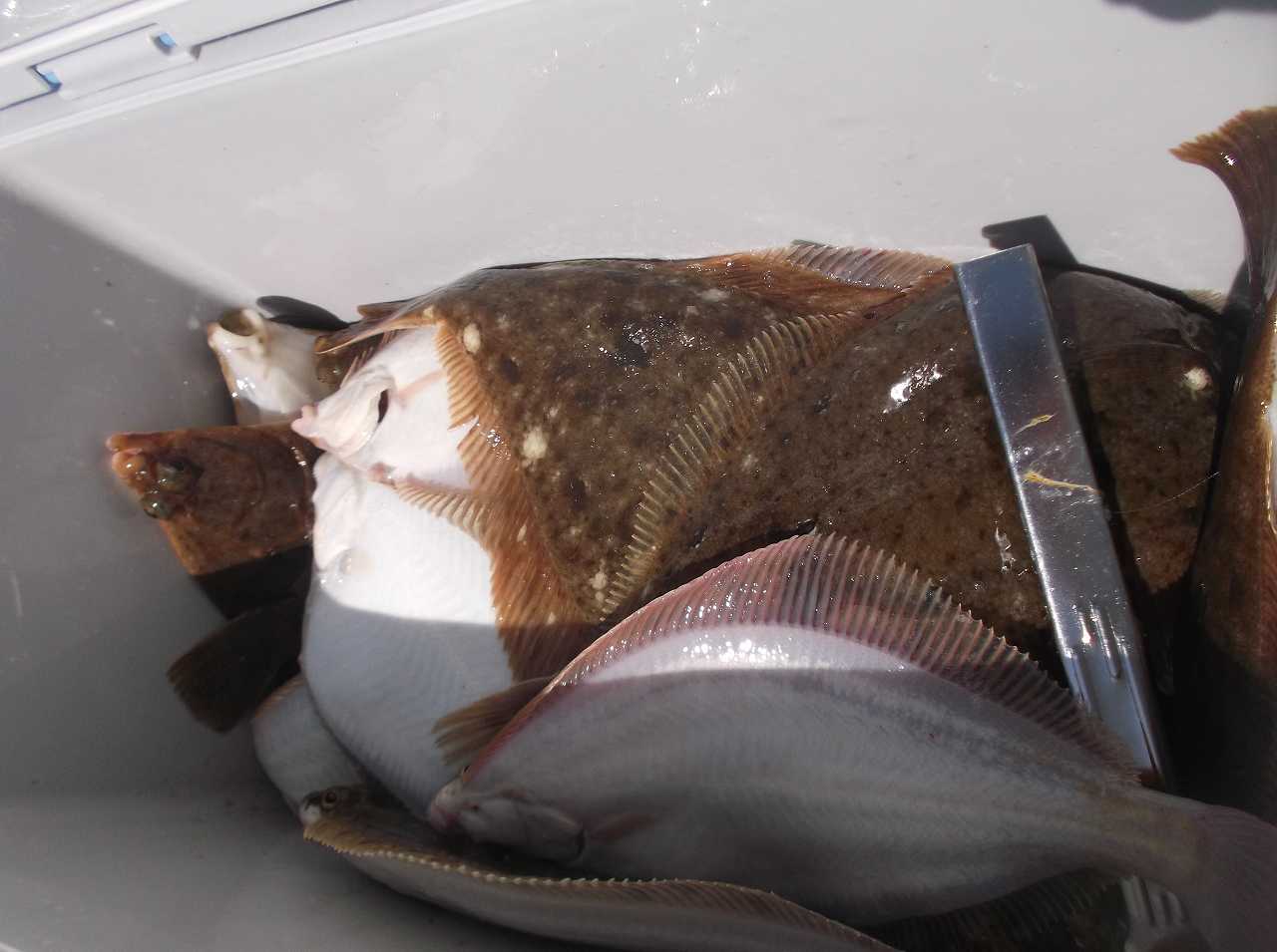 また後半の1時間ほどはアタリも激減しました。息子はラスト1時間半で1枚上げたきり。ちょっと最後になって減速でした。それでもその時間せんばは強いアタリとけっこうな手ごたえのカレイ、上げてみたら初めてのイシガレイをゲット。ちょっとうれしい一瞬でした。でもイシガレイにしてはサイズは控えめの尺ちょいほど。ラスト10分のアナウンスで魚をクーラーに移しながら数えます。