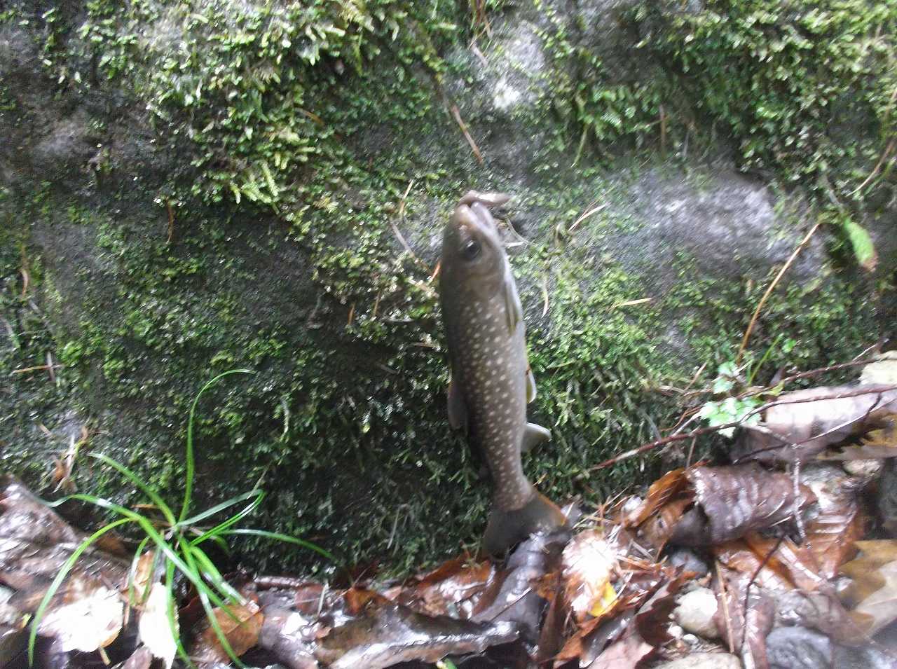 どばを流すとさっそくアタリ。くわえて走ったのか、水中の木に引っ掛かりいきなりのロスト。そこからアタリはあるものの、かじられるだけ。ちょっと小さいのでしょう。少し上で小さめのイワナ。これは針を飲まれてしまいやむなくキープ。せめて7寸をと狙うのですが釣れるのは6寸ちょいのリリースサイズ。何回かリリースしますが、飲まれたやつだけ魚籠に。
