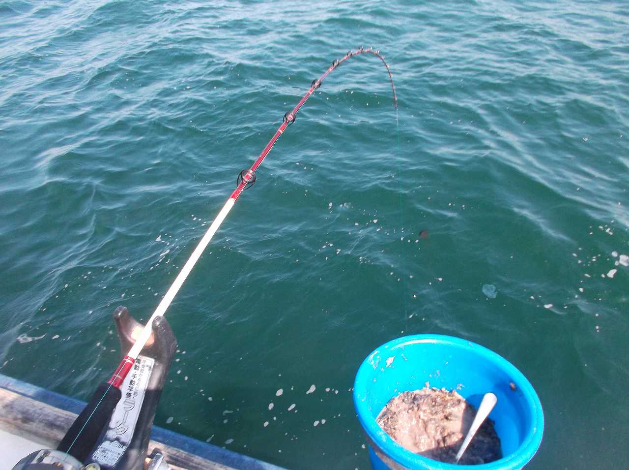 せんばはロッドキーパーをセットして、家内のお世話しながら釣る体制。大潮ということで、午前中は流れが速くて難しかったそう。家内が初めて、と船頭さんい言うと、じゃあ浅いところでやるから、と言ってもらい午後は近場を攻めることに。25mくらいの深さでスタート。餌の赤タンを付けて、コマセかごにイワシのミンチを詰めて、リールのクラッチを切って・・・・・ととりあえず、一連の動きを教えます。大体わかったようなので、せんばも竿を出してコマセをまきます。