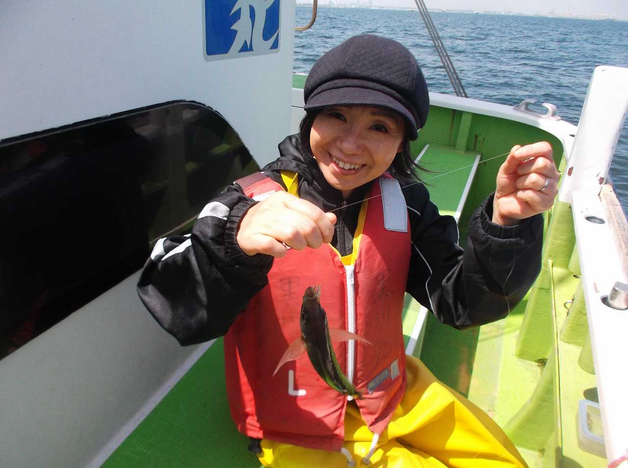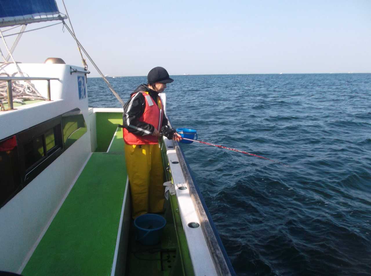 釣れるペースが落ちてくると、家内の顔が曇りつつあるので、様子を聞くとちょっと気持ち悪いとか。船酔いのきざし?遠くを見て、釣るようにアドバイス。それでもラスト1時間ほどはまたアタリが出だして、忙しく船酔いはどっかにいってしまったみたい。このあたりになると、自分でコマセをまいて、アタリを取って、取り込みまで一人で出来るようになりました。