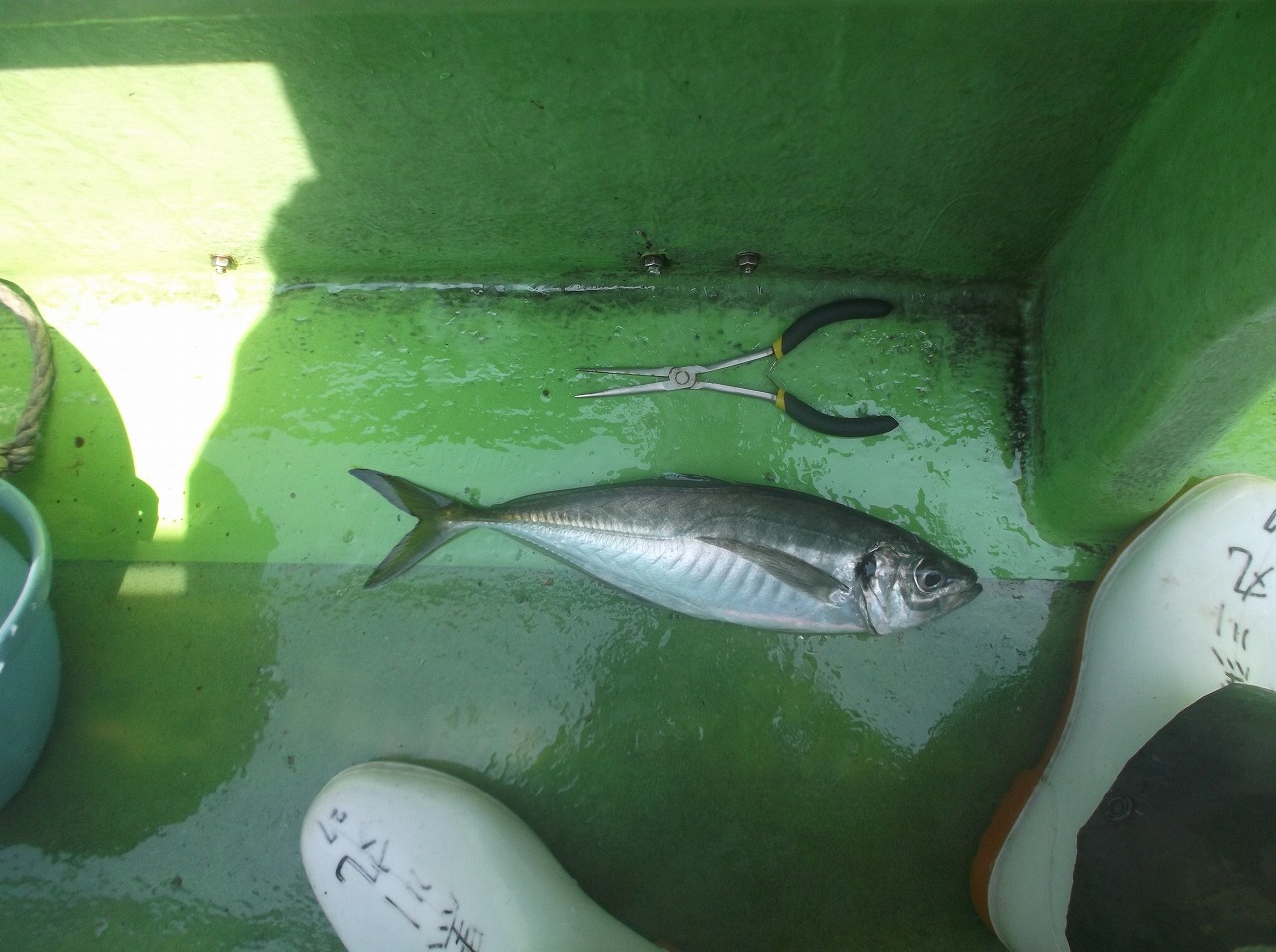 釣り場に着いたら、さっそくその船長さんが一度友人に釣り方まで教えてくれました。専門家におまかせ出来てなんてラッキー。せんばは自分の釣りにいそしめます。5分ほど教わり、彼も釣り始めます。最初の10分くらいはひたすらコマセをまいて魚を集めます。船頭さんからは後半潮が速くなるから、早めに釣ろうねー、と言われます。4回目くらいにアタリがあり、1匹目ゲット。次のアタリはちょっと弱いかなあ、と思っていたらサバ。隣の友人は「あたり?」と首をひねっています。船頭さんに「ほら、アタリだよ!」と言われやっぱり・・と理解したよう。