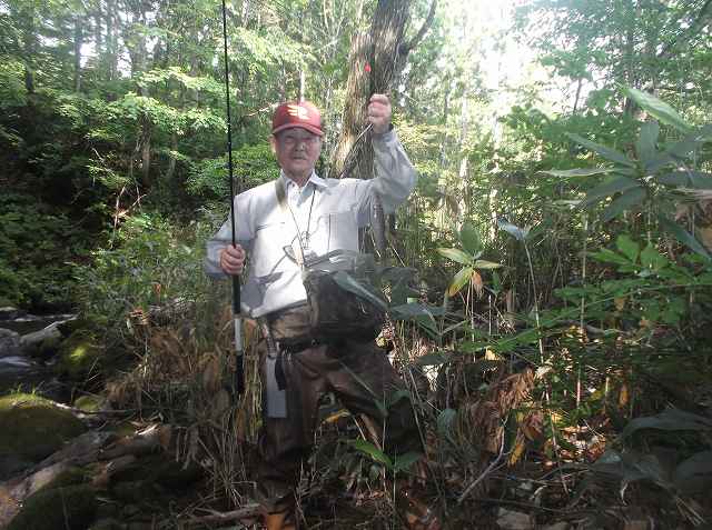 それから二人で釣り上り、例の大淵に到着。ここまで釣ろうとドバを流すものの、ここには留守のようでした。魚影が少し復活したような感じがしたのでちょっと安心して竿をしまい、次の沢へ向かいます。ここは2年前にせんばが尺2寸を釣った川で、秋に良い川です。ここもせんばが上流、師匠が少しだけ下流を様子見です。20分ほどで大物を釣った淵に着きますが、今年は水も少なくてダメでした。そこから二人で上流を攻めます。