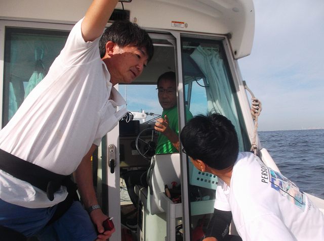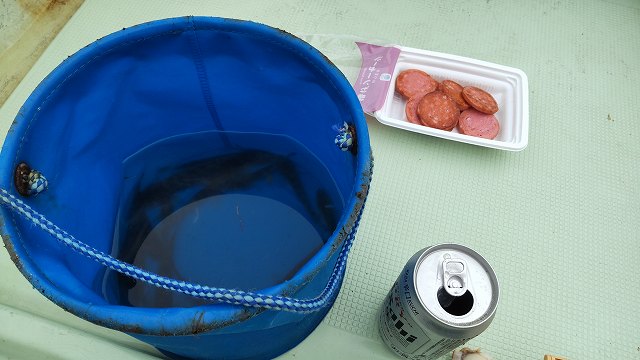 乗り合い船も密集していますが、船上は極めて静か。あれ?釣れてない?と船長はじめしばらく眺めていましたが、全く釣れていない様子。潮止まりでもあったのですが、更に30分ほど走ることに。情報を駆使しながら釣れてそうな場所を探します。結局どこも不発で最初の密集地帯に戻りますが、半部くらいの船は離脱していました。潮が動き出したら、と期待を込めてかご仕掛けを投入。今回の網かごやてんびんなどはパパさんやまんすりーさんにお借り。おんぶに抱っこ、って感じです。
