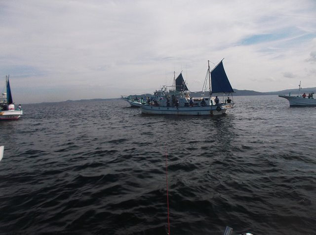 9時半ころからようやくアタリが増えましたが、やはり渋いのでしょう、かじられておしまい、とか途中でバラしてしまう方も多いようです。船頭さんも「5人そろって当たって2匹しか上がらなんだよー」とボヤいてます。(笑)10時半の折り返し点でせんば5匹で友人2匹。後半の追い上げを期待したいところですが、肝心な潮の動きは相変わらず。魚探には反応あるものの、食いっ気がないそうです。