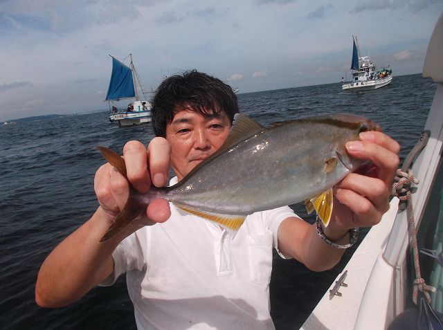 釣り始めますが、案の定アタリが少ないです。それでも最初のアタリで上がってきたのは型の良いフグ。もちろんリリースです。せんばの反対側で釣っていた船長の奥様が型の良いアジゲット。大体いつも結果を出されるのが奥様だとか。パパさんもそこそこのアジを上げました。せんばもフグの後にやはり大きめのアタリがあったものの針切れ。再びのフグだったかも。前方で釣っていたまんすりーさんが竿をけっこう曲げています。やり取りの後タモに入ったのはナント50センチ超えのクロダイ。その後パパさんもやり取りしながら上げたのはカンパチの子供ショゴ。30センチくらいでしょうか。アジは少ないものの魚は見られます。ところがそれからはアタリがあっても小アジおんりー。サビキで釣れるようなサイズばかり。2時間ほど粘りますが、船長さん判断で場所替え。