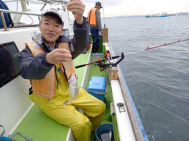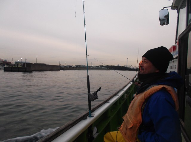 最初のうちは数投ごとに船頭さんがポイント移動。潮が止まるので、ポイントを探すとのこと。天気は曇りでそれほど寒くはありません。波もそれほどでもなく、コンディションは最高です。スタートは調子良かったものの、やはり20分ほどでアタリが激減。あってもかじられておしまい、ということも多々。我々は右舷側でしたがなぜか全くアタリがなく、左舷側のみ15分くらい釣れたようです。