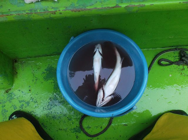 3時ころに大満足して終了。船長さんから「最後にキスを釣っていく?」とお誘いいただきましたが釣り的には満足しちゃってキスはまたの機会に、ということで終了。ボートを陸に引っ張り上げてもらい、船の清掃と、道具を洗って解散。パパさん、まんすりーさんは翌週もアジ釣りとのことで、アジは8割いただいてしましました。船長さんは橋脚で一時入れ食いになったウルメイワシとアジ数匹だけお持ち帰り。せんばはアジたくさんとイワシ15匹くらい。クーラーがいっぱいです。(笑)