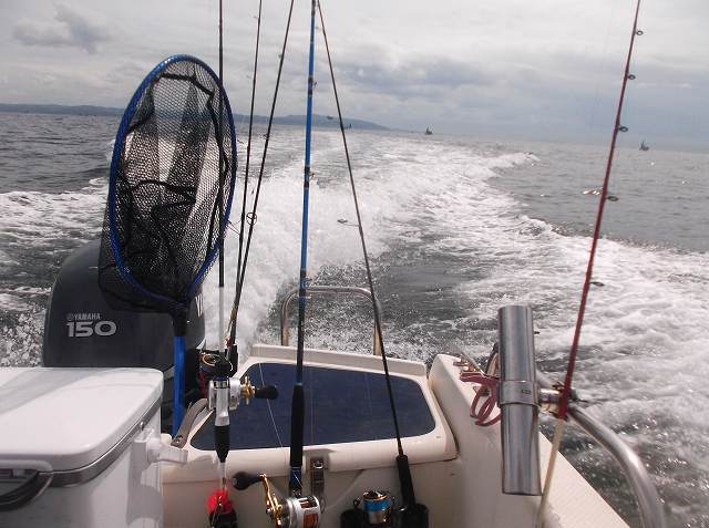 乗り合い船も密集していますが、船上は極めて静か。あれ?釣れてない?と船長はじめしばらく眺めていましたが、全く釣れていない様子。潮止まりでもあったのですが、更に30分ほど走ることに。情報を駆使しながら釣れてそうな場所を探します。結局どこも不発で最初の密集地帯に戻りますが、半部くらいの船は離脱していました。潮が動き出したら、と期待を込めてかご仕掛けを投入。今回の網かごやてんびんなどはパパさんやまんすりーさんにお借り。おんぶに抱っこ、って感じです。