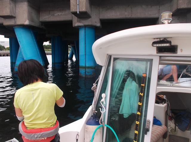 木更津方向に戻りつつ、数か所ポイントをチェックするものの、どこもパッとせず。木更津近辺の橋脚まで戻ってきました。陸っぱりからも届きそうなそんな場所に何故か乗り合い船。しかも川崎からの船らしいです。今日はどこの船も苦戦しているようです。それでも小ぶりなアジがぽつぽつ釣れている様子。ここからはサビキ仕掛けに変更します。