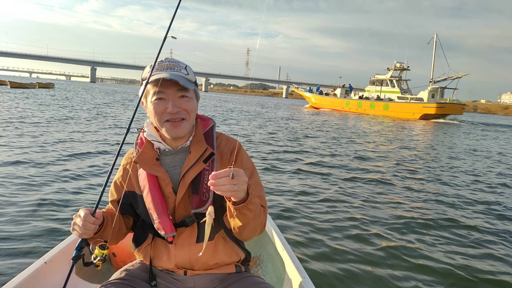 ようやくそのポイントで天ぷらサイズをゲット。やはり10センチを超えると引きが違います。これが10匹ほど揃うということなしです。それでも一つずつアタリをとりながらはぜを拾っていきます。ペースは相変わらず時速10匹。別の船頭さんが来て様子を聞きますが、どこも様子は同じようです。後半は更に河口へ向かうことにして、ボートを下流まで引いてもらいます。帰りも迎えてきてくれる、ということで安心して下流を攻められます。