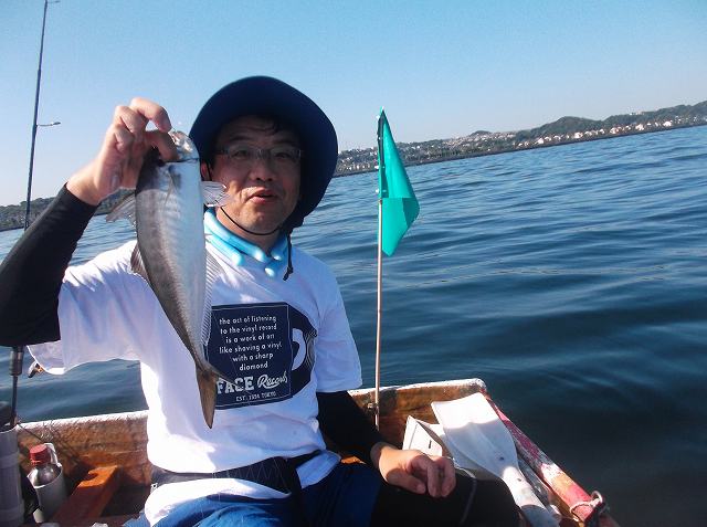 その場所も実績あるところらしいのですが、アタリはありません。反応はものすごく出ていて「アジじゃないのか?」と不思議がる二人。そこでも1時間ほど粘るものの、結局食わないなあ、ということで場所替え。沖で一発大きいのを狙う前に、もう一つ別のポイントを見てからにしましょう、とボートがけっこう集まっている場所に移動。さっそくアンカーを降ろすものの、場所が定まらずもう一度。やってみるといきなりのアタリ。上がってきたのは20センチを超えるアジ。これこれ、これを待っていました。