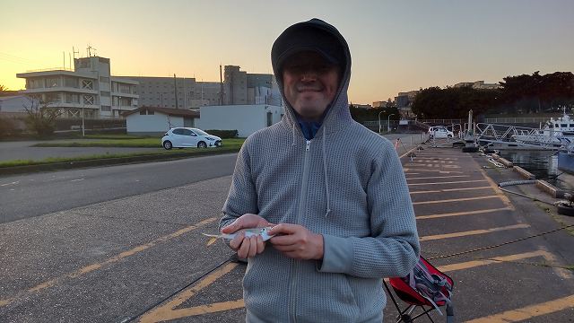 4時半ころになって日が傾いてきて、そろそろ本気モード。コマセの量も増やします。反対側のおっちゃんを見ると、竿を上げていてどうも鯵が釣れた様子。ポツリポツリと上がっています。これはこっちもそろそろかなあ、と更に気合が入ります。でも5時を過ぎても沈黙が続きます。で、ようやく5時半になってから友人の竿にアタリ。ようやく最初の1匹がかかりました。それほど大きくはありませんが、貴重な1匹です。