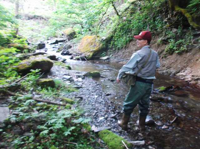 6時にはいつもの川に到着。5月ということで、師匠がウェーダーを貸してくれました。水が冷たい時期は助かります。最初に入った川はいつも様子見の川。大体いつも空振りして、次の川へ向かうのですが、今回もやはり20分ほどやって師匠がヤマメ1匹釣っておしまい。反応が薄く、ここは釣り人が入ったようで、次の川へ向かいます。次の川は師匠が今日メインで攻めるつもりのところ。せんばも毎回そこそこ釣っている川でした。