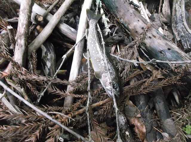 今日は4時間ほどしか釣りが出来ないので、あと一か所釣ったら場所替えとか。更に上流へ行ったところに堰堤が。落ち込みの所はいつも魚がいるからと教えてもらいそこに流します。と、すぐにググっとアタリです。しっかり食わせて、釣れたのはそれほど大きくはありませんが、ヤマメです。これでボウズは逃れました。(笑)師匠はそれを見て安心して下流の方へ向かいます。せんばは堰堤まわりをじっくり狙いますが、20分ほどやっても2匹目は出ず。師匠はそこそこのを1つ上げたようです。