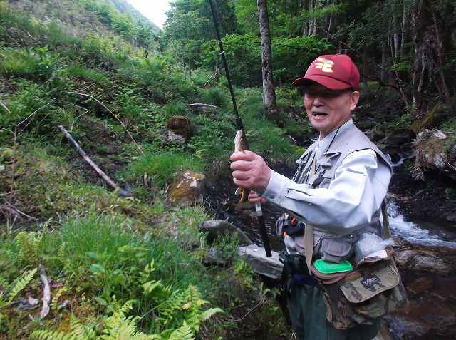 「あと3匹で20だね!頑張って」って師匠に言われ、着いたのが3つ目の川。ここは以前師匠がクマに遭遇した川で“熊の川”なんてあだ名の川です。(笑)二人でピストルを鳴らしながらいけば大丈夫だろうとそれからも通っているとのこと。この川では浮き釣りの師匠のペース。ポンポンとイワナを上げていきます。せんばもどばミミズの威力でたるみや、淵で拾っていきますが、さっきの川よりは小さめのイワナ。逆に師匠は7,8寸サイズを上げていきます。