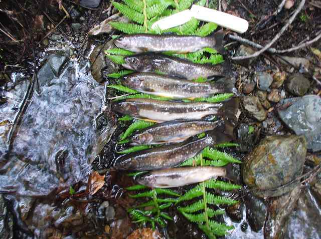 2時間ほど釣り上がって師匠は10匹、せんばは7匹。師匠はサイズ的には少し不満げ。尺近くのものが出ない!って言ってましたが、せんば的にはかなり良いスタートでした。一度車に戻り、もう少し上流へと向かいます。餌も補充してさっきの川の上流部に入ります。今回どばミミズを40匹以上持参していたのですが、早くも半分近く消費。かじられたり取られたり、反応が多くて楽しいです。上流では釣り始めはそれほど反応が良くなかったのですが、30分ほど釣り上がってからいきなり釣れ始めます。師匠も私も一流しごとにアタリをとらえます。まさに1淵1匹って感じ。二人で?マークで「きっと竿抜けポイントに当たったんだねー」としゃべりながら釣ります。サイズも7寸、8寸と徐々にアップ。あっという間につ抜け達成です。師匠は「あーっ!」と声を。どうしたのか聞いたら尺近いものを落としてしまったとか。うーん残念。それ以降、しばらく師匠は小さめのイワナ、せんばは満足サイズのイワナが釣れてきてちょっと不思議でした。