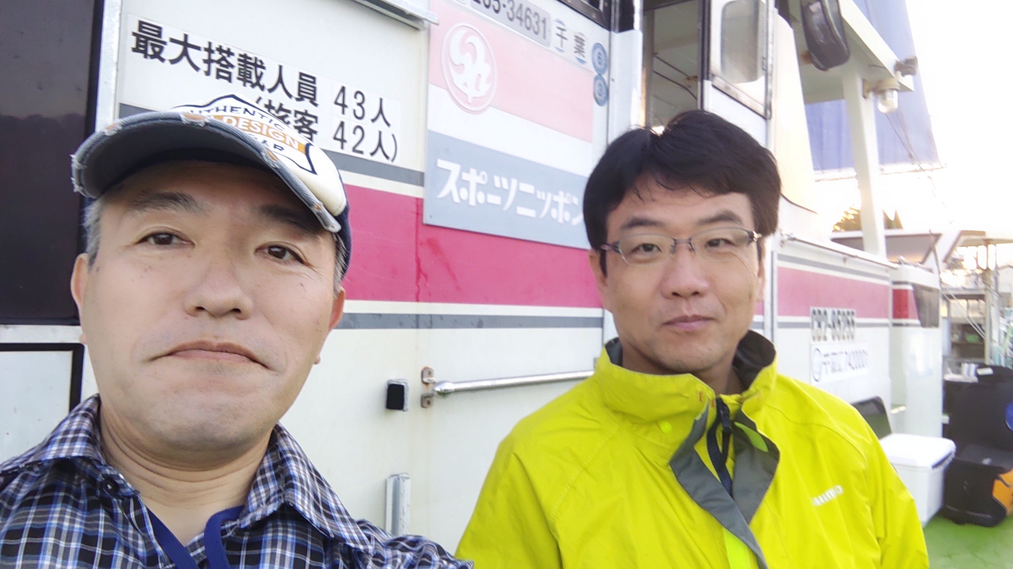 勝山港に4時半集合、とのことでせんば家出発午前2時。前の日は朝5時に起床して、夜9時には床について少しでも睡眠を取ろうという作戦。それが正解で4時間以上は寝られ、1時半起床。時間通りまんすりーさんに迎えにきてもらい、出発。下道・高速混ぜながら現地には4時すぎに到着です。月曜ということでガラガラのはずでしたが、何故か駐車場には車がいっぱい!隣にはきれいなおねいさんが二人。「?」もしかしてテレビの取材?それならばこの人数、納得です。案の定、BSの釣り番組のロケでした。さすが関東、こんなこともあるのですね。