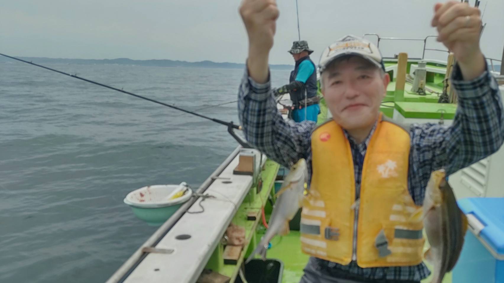 それからも潮は速いものの、ポツポツとイサキが釣れてきます。ネットでは大爆釣と先週は書いてあったものの、天気が一旦崩れたのでこの感じは、まあ予想の範囲です。たまーにダブルで上がってきますが、あまり待っているとお祭りをしてしまうこともあって悩ましい限り。それでも2時間ほどでつ抜け達成です。