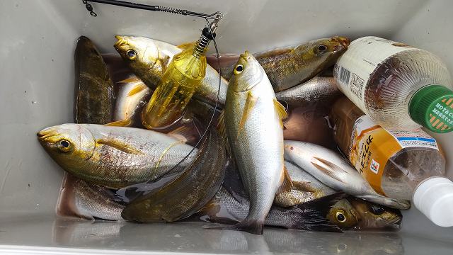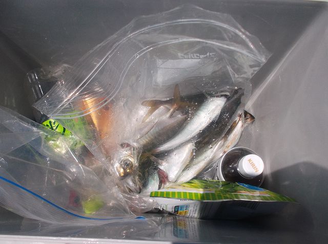 せんばも後半は数回バラシや針はずれがあり、お祭り等に苦戦しましたが、何とか19匹まで数を伸ばしました。鯵・サバ合計して29匹。処理とか考えるとまあ理想的かもしれません。まんすりーさんはイサキで30匹ほど。帰りに車の中で釣り方を聞いてみると棚から3m落としてコマセワークをしつつ3m上げ、ピッタリ指示棚で待つ、という釣り方。この3mの中でアタる場所を見つけよう、としていた私とはこれが違ったわけです。まあ爆釣の時は関係なく入れ食いらしいので、今後の参考です。