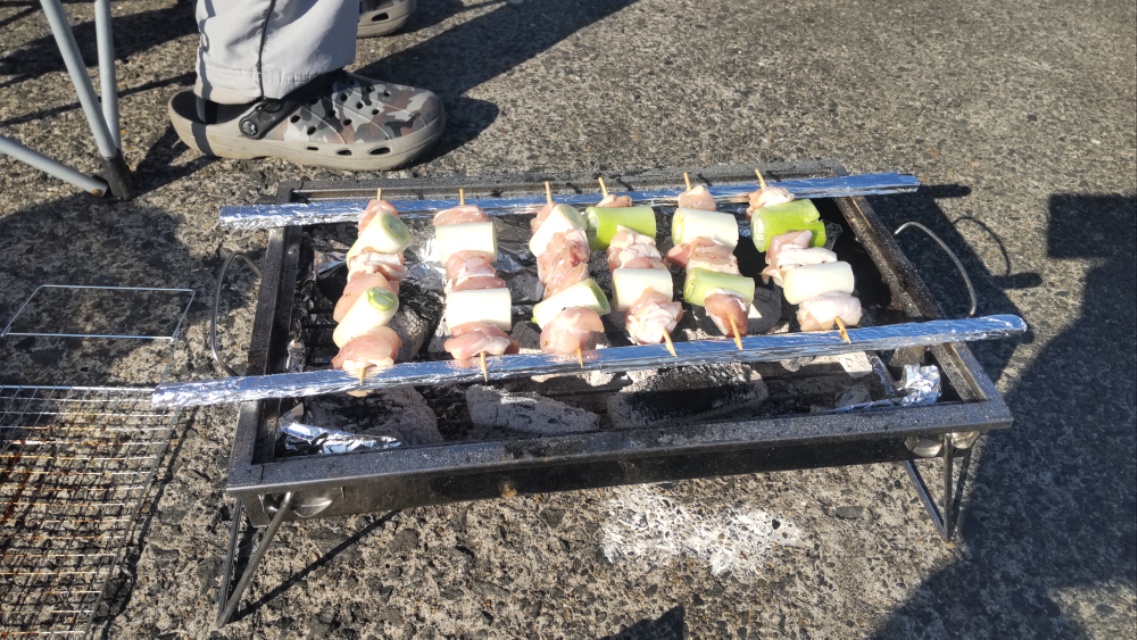 まんすりーさんは手慣れたもので、火を起こしてイカを捌き、焼く準備。せんばはとりあえず1本竿を出して、釣りをしてますよ、というアピールを。小一時間ほどでイカ焼きにウインナー、買って来た枝豆と良い感じで出来上がりお昼がスタート。と、イソメ餌ではぜ狙いで出していた竿が「チリリン!」となります。巻いてみると何か付いている感じ。10センチを超えるハゼが釣れ、二人で「いるじゃん!」と真剣に釣りを始めます。このサイズのはぜが揃えば天ぷらが待っています。でも小さいアタリはあるものの、乗りません。仕方ないので今度は焼き鳥を焼き、食べつつまったりです。