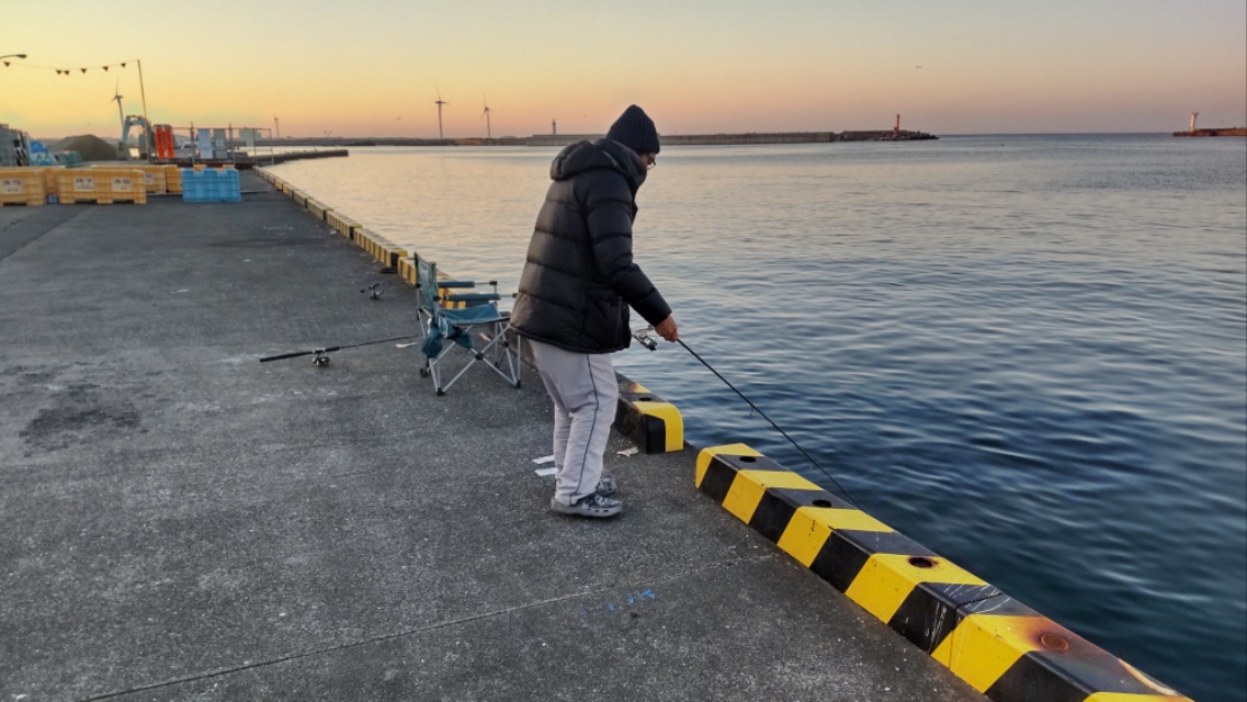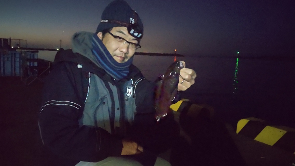 薄暗くなってきた4時半ころに釣り開始。薄暗いうちはアタリもなく、まったりと時間が流れます。周りにはイワシ狙いのサビキの方が一人。ポツリポツリとイワシを上げています。聞くと群れが入ると入れ食いになるものの、あとはポツポツらしいです。それでも50匹ほどは釣っている様子。我々は残念ながらサビキの準備はなし。ドンコ一本です。うーん、ダメかなあ…と思い始めた5時半ころせんばの竿に待望の「チリリン!」。上げると生体反応。20センチほどのドンコゲット。