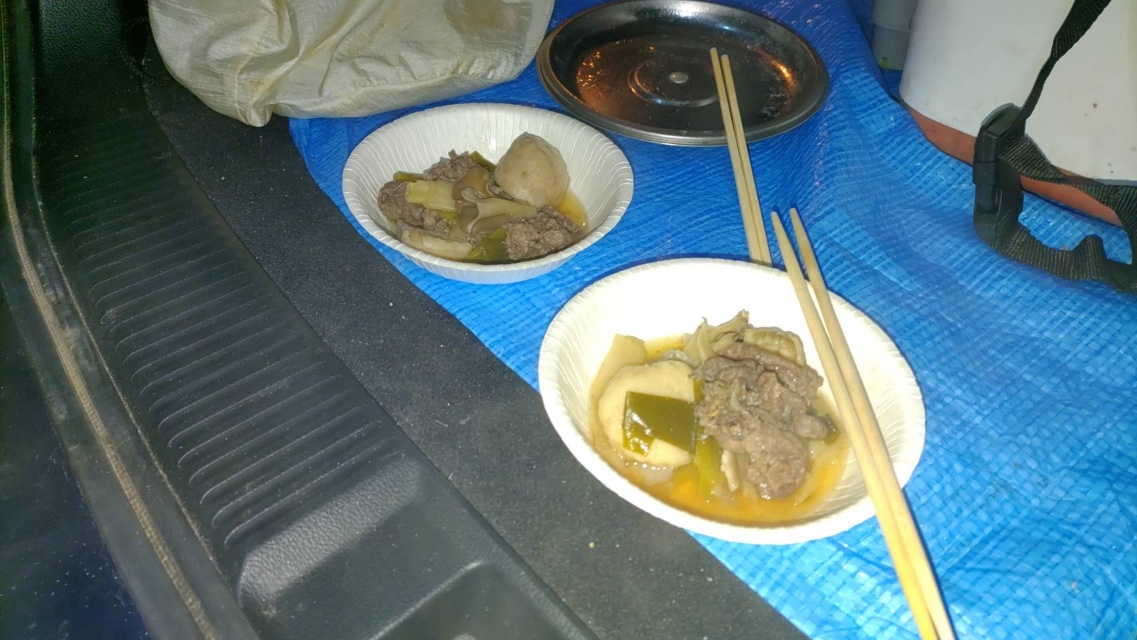まんすりーさんの竿にもチリリン!いよいよ時合到来か?さば餌で食い込みが悪いのか、チリンだけで乗らないこともしばしば。それでもまんすりーさんが2つ連続で上げ、せんばも同様に連続。しかも1匹は25センチオーバーの刺身サイズ。ところが30分ほどの活性化タイムの後はまたまた落ち着いてしまい、せんばもまんすりーさんも8時の終了まで一つずつ上げておしまい。暇な時間は芋煮を温め、〆のカレーうどんを食べる時間に。これはこれでおけ、でした。(笑)