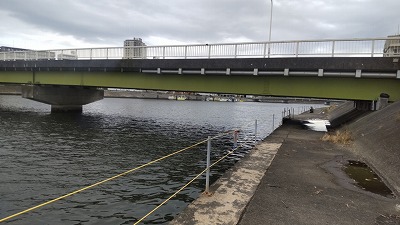 そんなこんなで鶴見川に戻り、前回よりも上流に入ろうと歩いていくと釣り他人発見。そこそこ釣れているようです。釣り場までぐるりと回ってこないと入れないらしく、前回のエントリーポイント近くから逆の上流に歩きます。その方は3本竿で置き竿。7匹釣れたとのことで、アタるポイントとかこの一帯の情報収集。この時期やはり釣れる数は落ちているそうです。一昨年が爆釣したらしくそれから通っているとか。時間は正午過ぎ、そろそろ干潮から上げに変わる時間帯。さっそくその方の下流側で竿を出します。