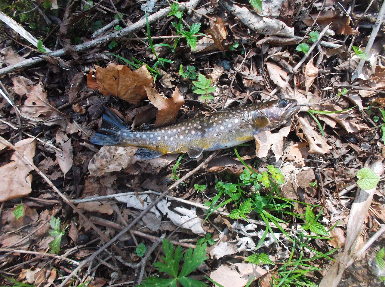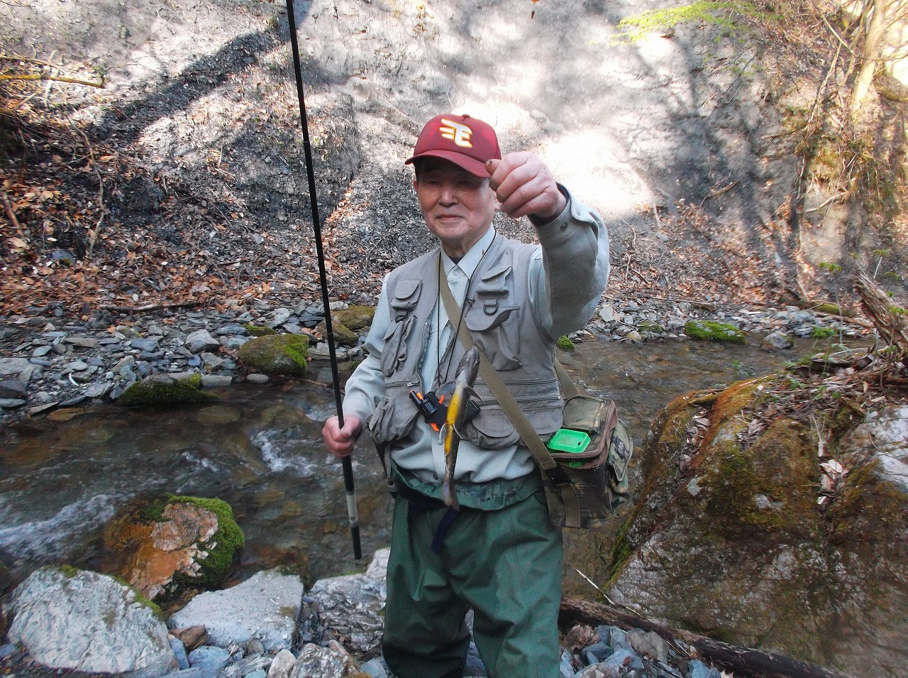 今日は反応があるので、しばらくこの川を釣り上がることに。川の水は冷たいですが、川べりには山菜が出始め、こごみやアイコが自生していました。アイコだけは少し採って帰ろうと思っていましたが、師匠から次の川の方が多いよと聞いたのでしばらくは釣りに集中します。師匠の浮き釣りはやはり釣れ、落ち込み狙いの私とはペースが違います。1時間ほど釣り上がり師匠は10近く上げていましたが、せんばは3匹。堰堤まで来てようやくミャク釣りの出番。ポンポンと良いサイズを2つ上げ、おまけにもう1匹。前半は6匹で川替えです。