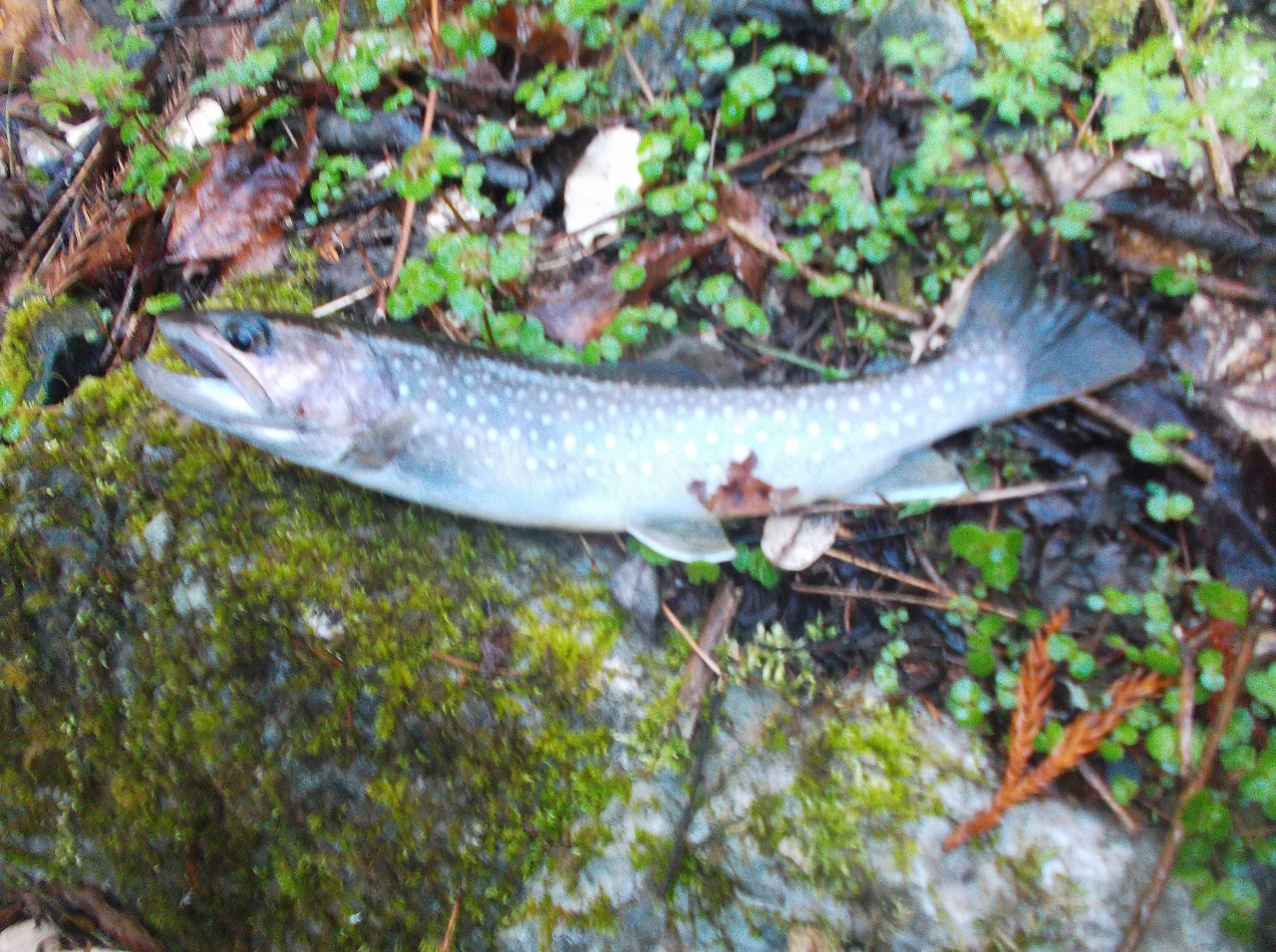 そこから上は師匠も今年初。水は少なく、それほどアタリは多くないものの、釣れたら7寸以上で8寸越えもたまに釣れます。さすがに師匠も84歳で全盛期に比べバラシの回数も増えてきたようですが、しっかり釣っています。それでも1時間半ほどしたら足が攣ったようで竿を仕舞いだしました。それを見ていたせんば、ふと見ると仕掛けが引っかかっている様子。あらまあ、と仕掛けを回収しに行こうと思ったら走り出し、けっこう大きなイワナが「釣れちゃい」ました。この時点で師匠は25匹でせんばは18匹。