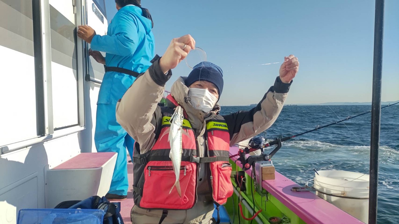 仕掛けを交換しながら、船頭さんにあと何分くらいで終わりですか?って聞くと「あと20分だね」とのこと。もう1,2流し出来そう。最後の1投は何か違和感、みたいな後に巻いてみたら今日イチの小さいなアジがダブル。これで終了。数えると22匹でした。小アジは最後の2匹のみであとは中~大アジ。1月に行ったアジ釣りよりもクーラーボックスは確実に重いです。片付けをして、船は港に戻りますが、20分ほどで帰港。やはり楽です。