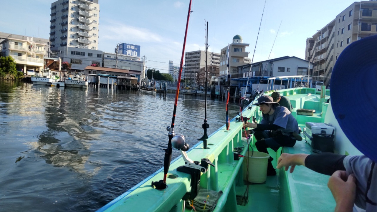 30mほど上流で竿を出します。1本は2本針の仕掛けを投げて鈴をつけ、1本は手持ちではぜ天秤の1本針。30mほどの船道狙いです。潮の変わり目だから最初の2時間くらいは渋いかなあ、と思っていましたが、30mちょいのところでいきなりのアタリ。即合わせしたらスカッと。うーん、残念。投げておいた方は回収すると餌がきれいに無くなっています。エサ取りがいるようです。