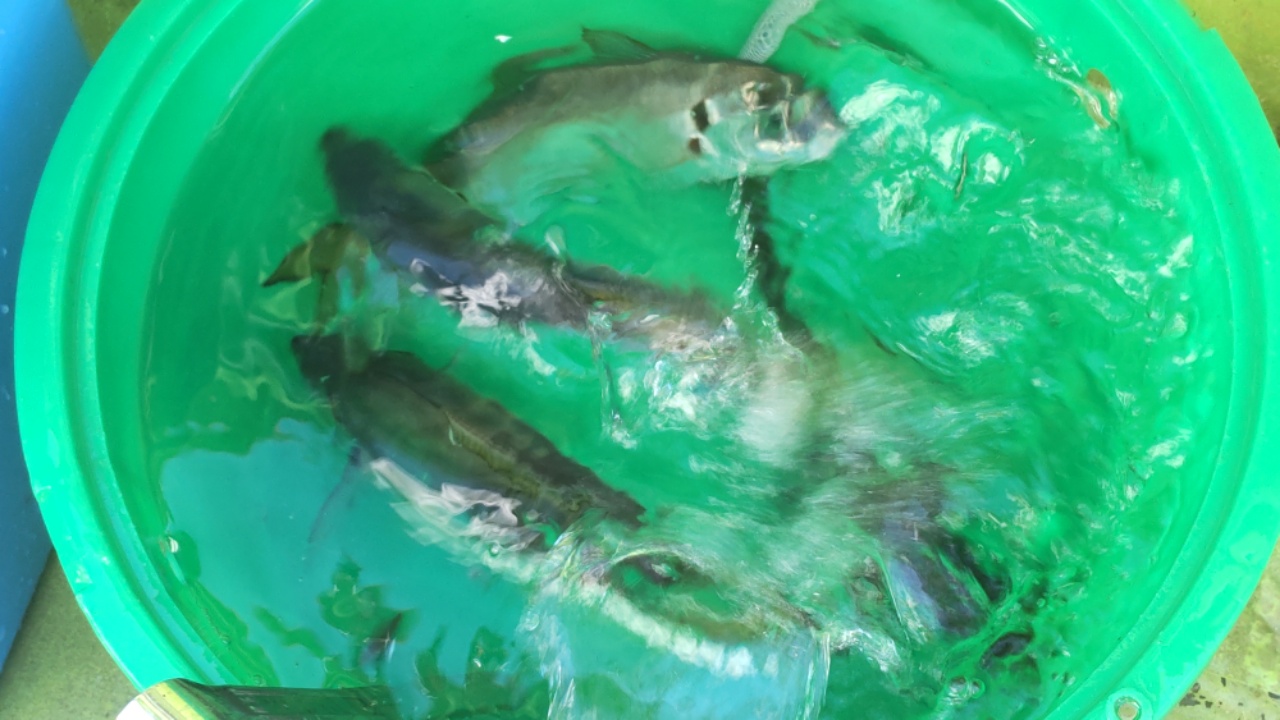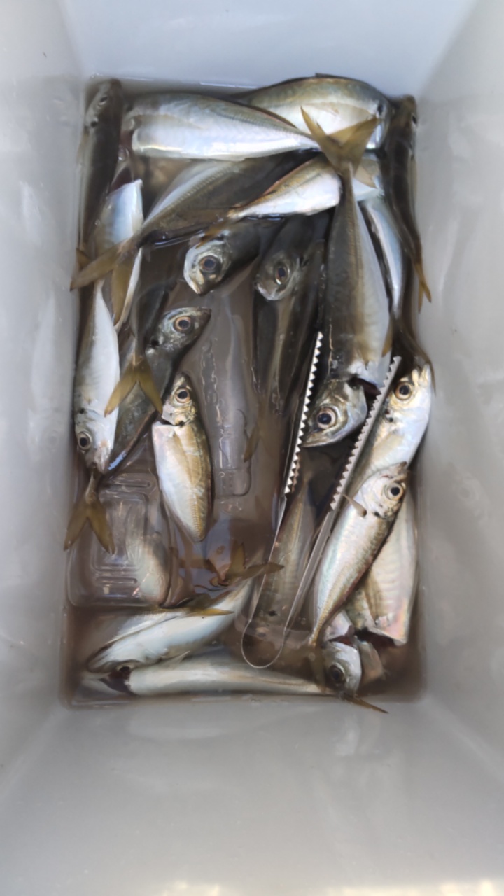 1時間ほど釣って、ようやくしっかりしたアタリで上がってきたのは、1匹目のアジ。30センチは超えていそうです。やはりポツポツと食ってきて2時間ほどでサバ2つとアジ3つ。まんすりーさんは倍の10近く釣ったのではないでしょうか。あとはイサキを入れるスペースをクーラーボックスにとっておくためこのあたりで一服しています。せんばはギリギリまで粘り、小さいアジを2つ追加して合計アジ5匹。サバは1匹リリースして2匹持ち帰り。8時前にイサキに移ります。
