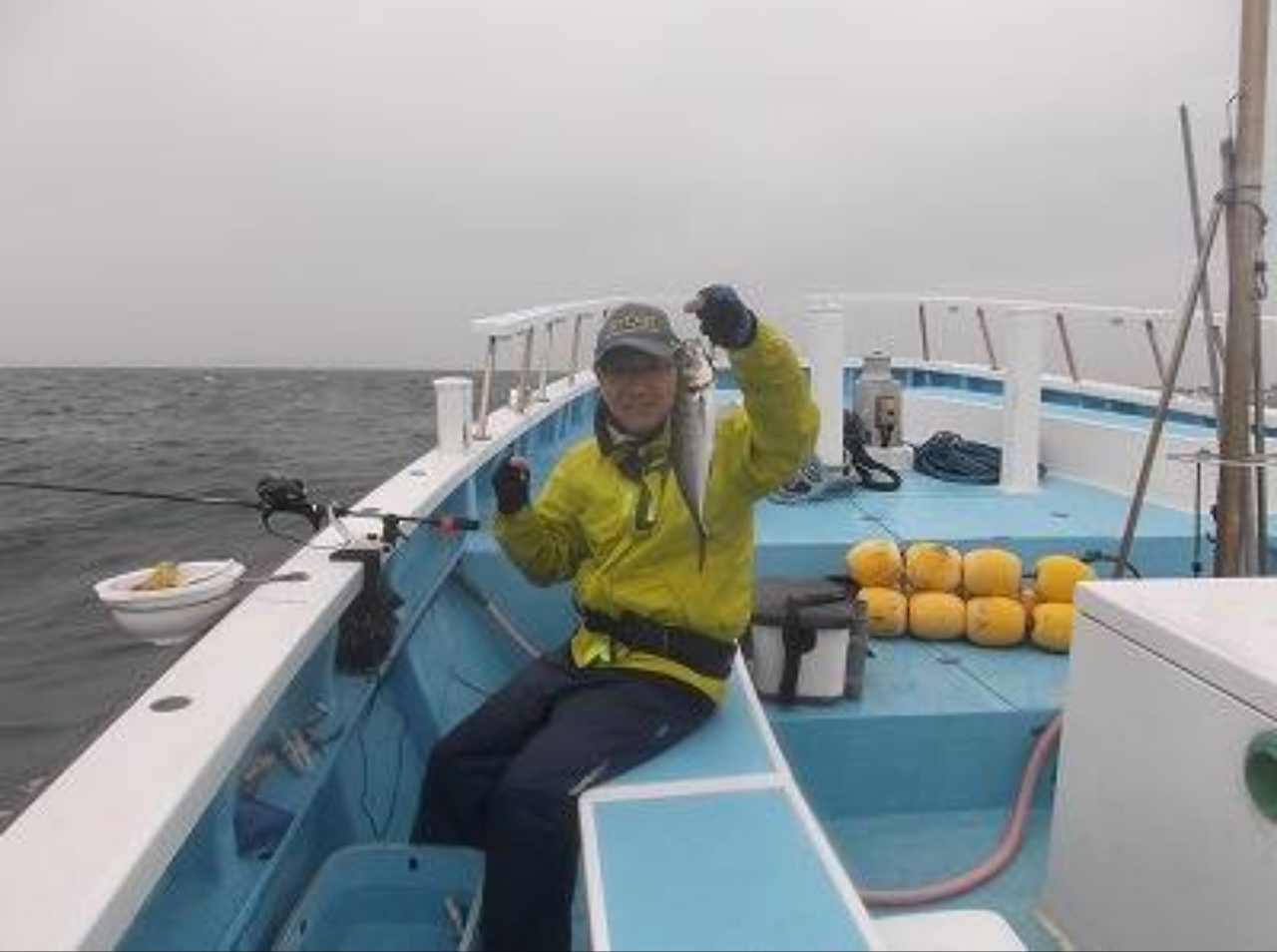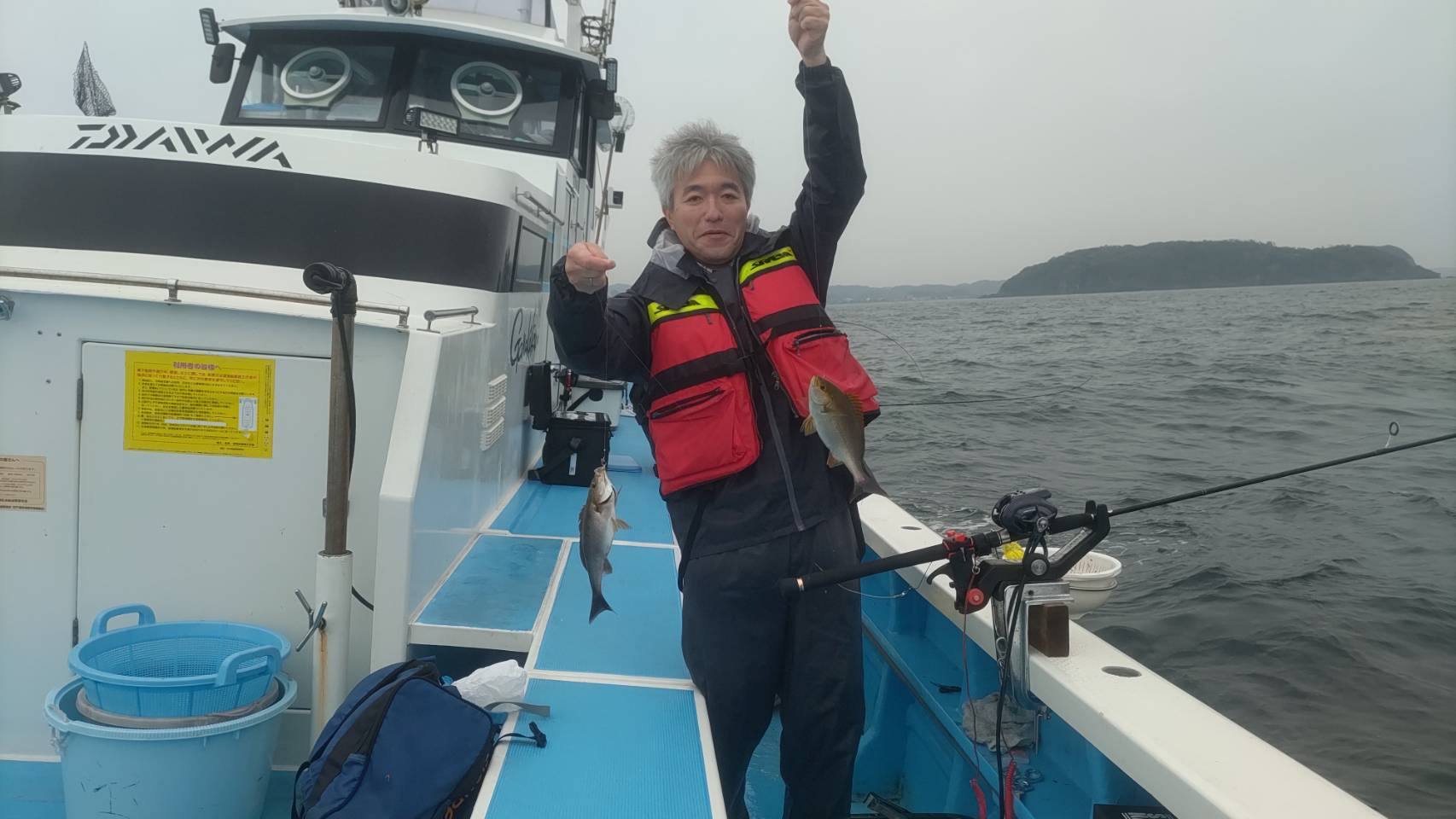 20分ほど移動しますが、波がすごいので後ろに皆さん避難。それでも波が飛んできて、カッパがびしょ濡れ。カッパ、良い仕事しました。ポイント移動が終わり、いざイサキ釣り。イサキのタナは20m~15mとこれもけっこう広め。仕掛けを変えて釣り始めます。22mまで落として、コマセを振りながら20mまで上げてきます。少しずつ更に上げていくと19mくらいでアタリ。1年ぶりのイサキのアタリです。グングンと強いアタリと引きで楽しい。25センチほどの良いサイズ。大体入れてタナを取るとしばらくしてアタる感じ。