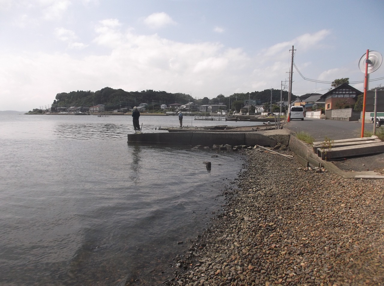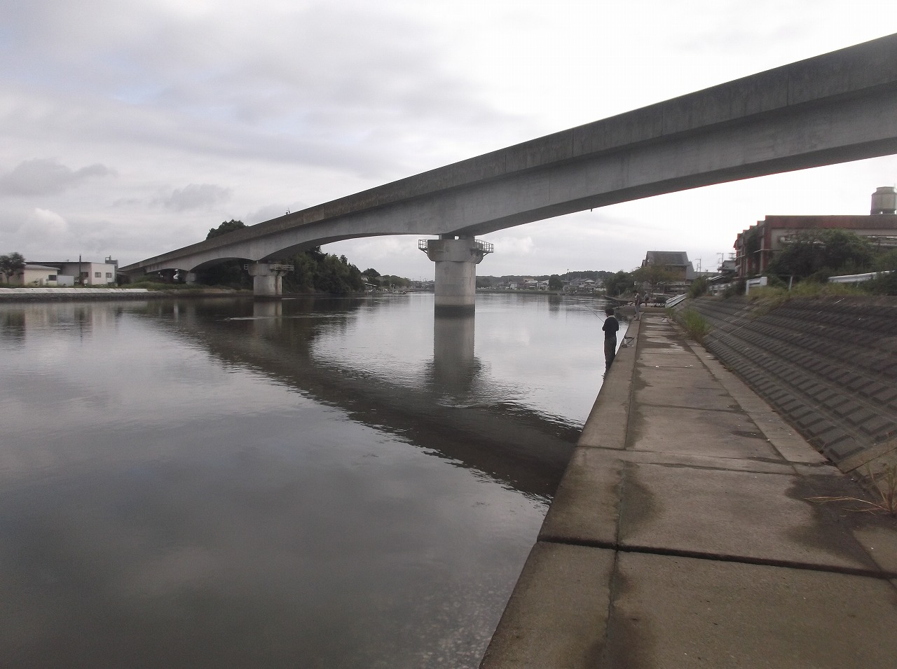 そんなこんなで鶴見川に戻り、前回よりも上流に入ろうと歩いていくと釣り他人発見。そこそこ釣れているようです。釣り場までぐるりと回ってこないと入れないらしく、前回のエントリーポイント近くから逆の上流に歩きます。その方は3本竿で置き竿。7匹釣れたとのことで、アタるポイントとかこの一帯の情報収集。この時期やはり釣れる数は落ちているそうです。一昨年が爆釣したらしくそれから通っているとか。時間は正午過ぎ、そろそろ干潮から上げに変わる時間帯。さっそくその方の下流側で竿を出します。