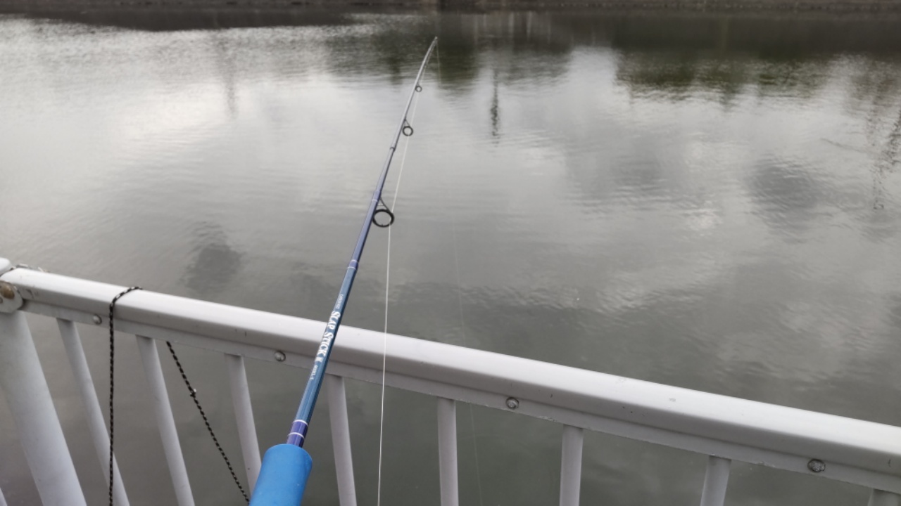 30~40mあたりで釣れた、とのことで、そこらへんを重点的に探ります。今の時期、3分くらい様子を見て、アタリが無ければ少し巻く、ということを繰り返します。1時間ほどは生体反応が無く、その方もアタリがないのかおしゃべりタイム。多摩川をホームグラウンドにしている方で、今の時期は大きなハゼを狙って鶴見川に通うらしいです。話しながらも全く反応が無いので、50mほど下流に場所を移します。そこでようやく初のアタリ。と言ってもたまたま竿を置いておいたら当たったので、餌を食いにげされました。さあ、と思ったらなんとポツポツ雨が来ました。