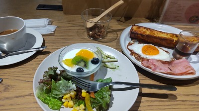 天気予報は晴れるものの、冬型の気圧配置で、寒くなる予報。とは言うものの、東北に比べたら楽勝の気温。荷物も軽くして、身軽で自宅を出ました。午前中は曇りで少し雨も残るらしいのですが、午後は晴れ。食事中に天候が回復する予定です。ところが、JRで踏切の緊急停止ボタンが押された、とのことで30分ほど遅れてホテル着。ゆっくり朝食、とはいきませんでした。