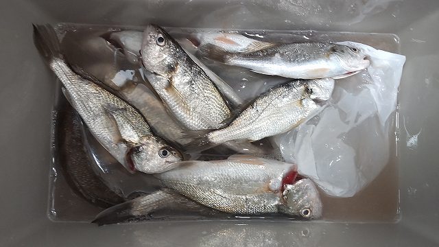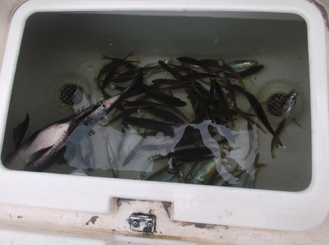6時から開始して10時ころにはかなり蒸し暑くなってきて、お日さまが顔を出したとたん気温がぐっと上昇しました。そろそろ二人ともお茶など水分に気を付けておにぎりの塩分やおかずを食べ熱中症対策しつつの釣りです。腰の弱いでせんば、座りっぱなしは段々しんどくなりつつあります。10時には77匹。大体折り返し点です。